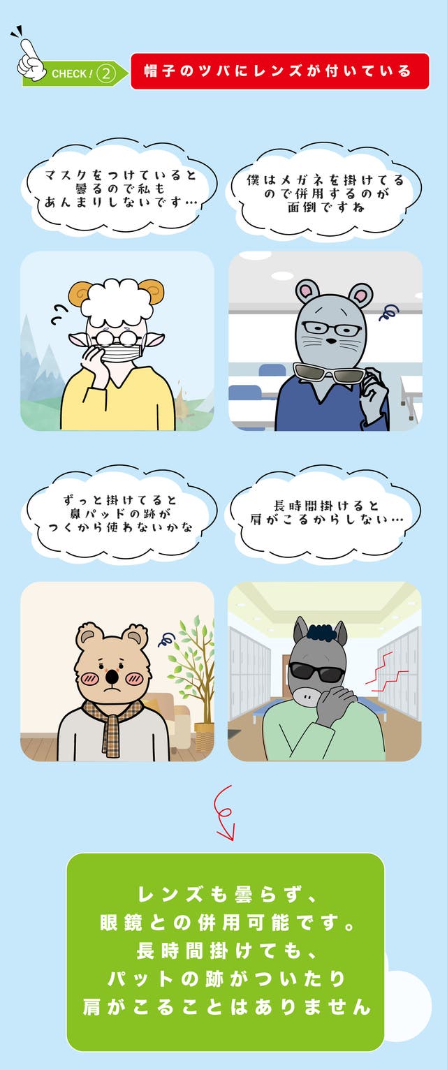●帽子を被るときの角度、部品の角度によってはレンズ部分が顔に接触することがあります。レンズ部分と顔との間に十分なスペースが確保できていることを毎回確認の上ご使用をお願いします。