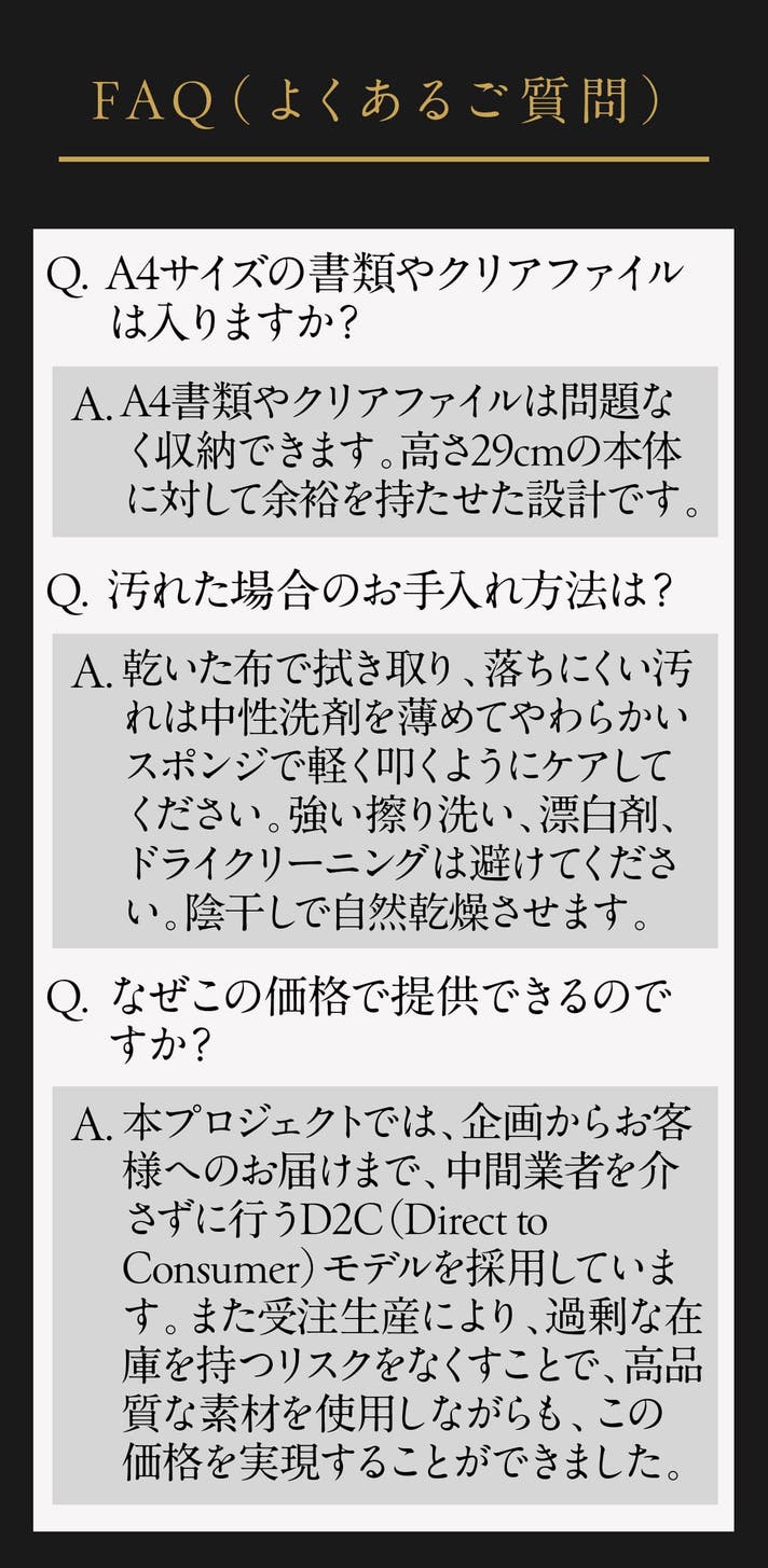 ※天然の革を使用しております。小さい色むら、バラ傷がある場合があります。革の個性としてご理解ください。 ※モニター環境により、実際の商品の色合いは多少異なって見える場合があります。 ※ご注文状況、使用原料の供給状況、製造工程上の都合等により、出荷時期が遅れる場合がございます。 ※本文中に記載させていただいたスケジュールは、あくまでプロジェクト公開時点の予定です。プロジェクトの性質上、配送遅延のおそれがございます。原則として、配送遅延に伴うキャンセルはできませんが、リターン配送予定月から3ヶ月を超えた場合には、希望者に限りキャンセルにて対応させていただきます。 ※原則として、サポーター都合によるキャンセル・返金は承っておりません。 (サポーター都合のキャンセル不可の例:イメージが異なる、サイズが合わない、誤注文、長期不在) ・対応条件: 商品の初期不良、またはお届けした商品がご注文内容と異なる場合、到着後14日以内にプロジェクトページの「実行者にメッセージ」よりご連絡ください。状況を確認の上、返金対応、または良品との交換対応をさせていただきます。 ●返金額: リターン金額(税込)の全額 ●返品送料/再送料: 実行者負担 【返品・交換をお受けできない商品】 ・サポーターの責任により破損、汚損が生じた商品 ・商品のタグ、付属品、パッケージ(箱、袋など)を紛失、破棄された商品 ・事前にご連絡をいただいていない商品 ・商品到着後、15日以上経過した商品 【交換をお受けできないケース】 ・限定品や同一商品の在庫がない場合など、代替品をご用意できない商品
