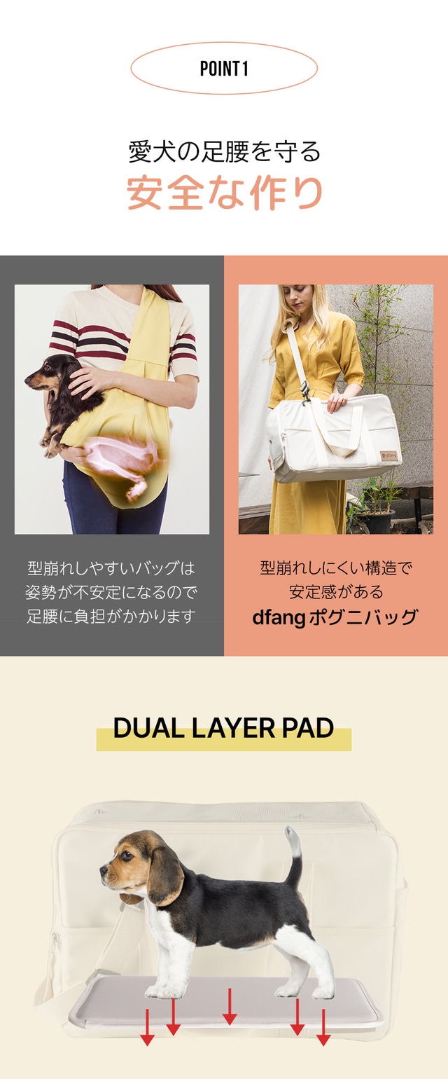 型崩れしやすいバッグは将来、ペットの足腰の健康が不安に感じることが多いのですが、その点、ポグニバッグは型崩れが起きにくい構造となっております。さらに、バッグの素材は撥水加工なのでお手入れがラクになっていることから、飼い主さまがペットと一緒にお出かけする時間をより快適に過ごしてほしいと思っております。
