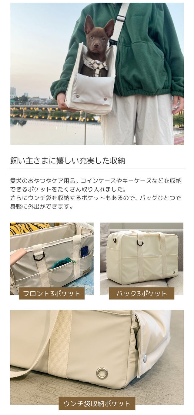 - 愛犬の飛び出しを防止するオートロックファスナーと肩の負担を少なくする持ち手カバーつき!