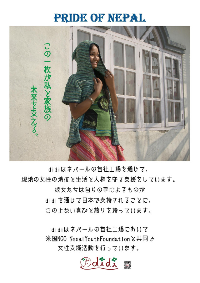 didiはネパールの自社工場を通じて、ネパールの女性の地位と生活と人権を支援しています。彼女たちは自分たちの手になるものが、didiを通じて日本で支持されることに、この上ない喜びと誇りを持っています。didiを生みだす彼女たちの合言葉は、日本語そのままの「イイモノ!」。ちゃんと意味を理解し、誇りをもって笑顔で唱えています。明るくひたむきに「イイモノ」を生みだしています。