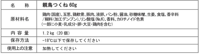 ・親鶏つくね(60g×20個) :一部に小麦・乳成分・卵・大豆・鶏肉を含む。