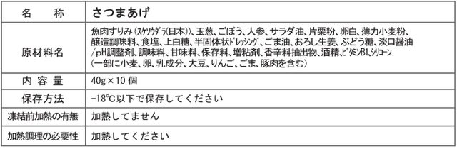 ・さつま揚げ(40g×10個) :一部に小麦・卵・乳成分・大豆・りんご・ごま・豚肉を含む