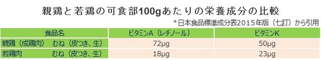 また親鶏(成鶏肉)のほうが若鶏と比べ、ビタミンAやビタミンK等、栄養も豊富なんです。