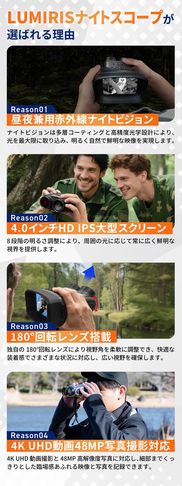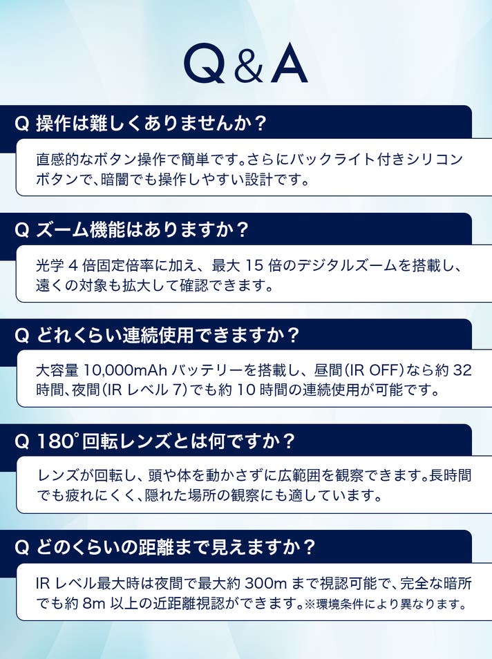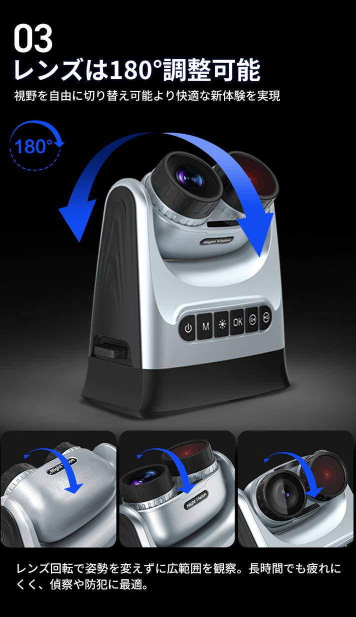 - 【180°回転レンズ搭載】頭を動かさず広範囲を自在に観察でき、快適・高効率なナイトビジョン体験