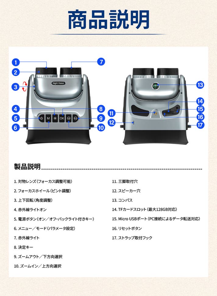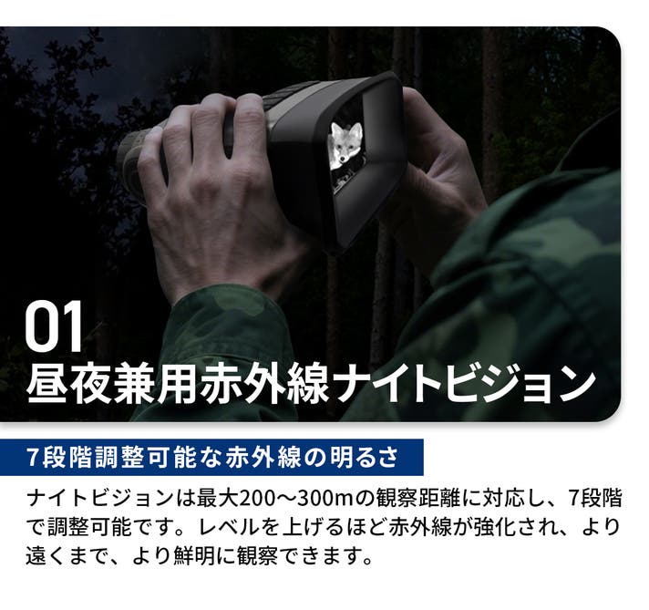 新しくデザインされた180°回転レンズのナイトビジョン双眼鏡は、これまでにない夜間冒険を提供します。どんな状況でも完璧な視点を得るために、視角を柔軟に調整できます。主な目的は、装着の快適さと使用の柔軟性を向上させ、異なる頭の位置や視角に対応することです。
