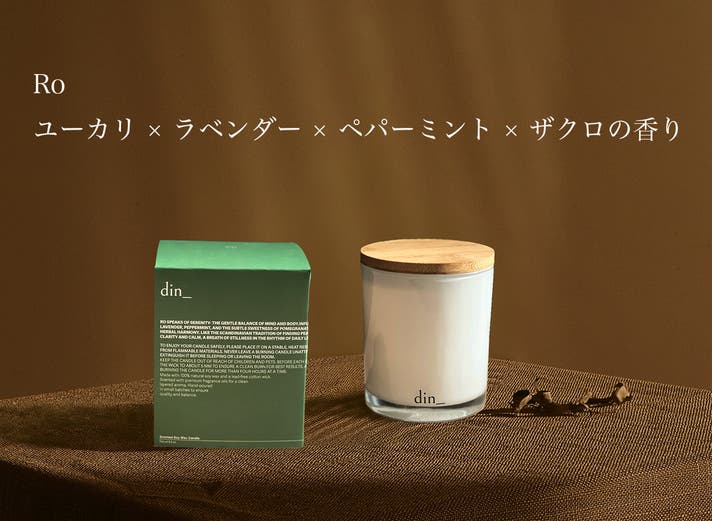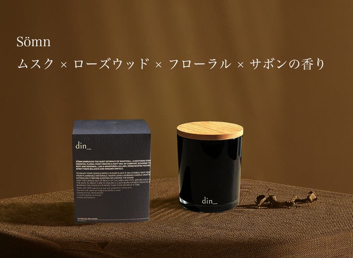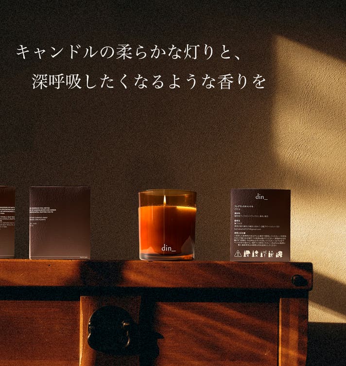 din_ のキャンドルは、環境に優しいソイワックスを使用し、自然由来の心地よい灯りを生み出します。 煤が出にくく、クリーンに燃えるため室内での使用も可能です。香りの広がりもやさしく、長い時間を共にしたくなる仕上がりです。毎日の生活に寄り添いながら、環境にも心地よい選択を提案します。