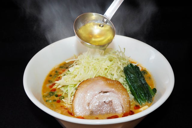 醤油のごまだれをベースにキャベツの旨味を濃縮したピリ辛スープが特徴です。唐辛子を練り込んだ特製麺を使用しています。コクとまろやかさがあり、最後まで飲み干せるスープです。