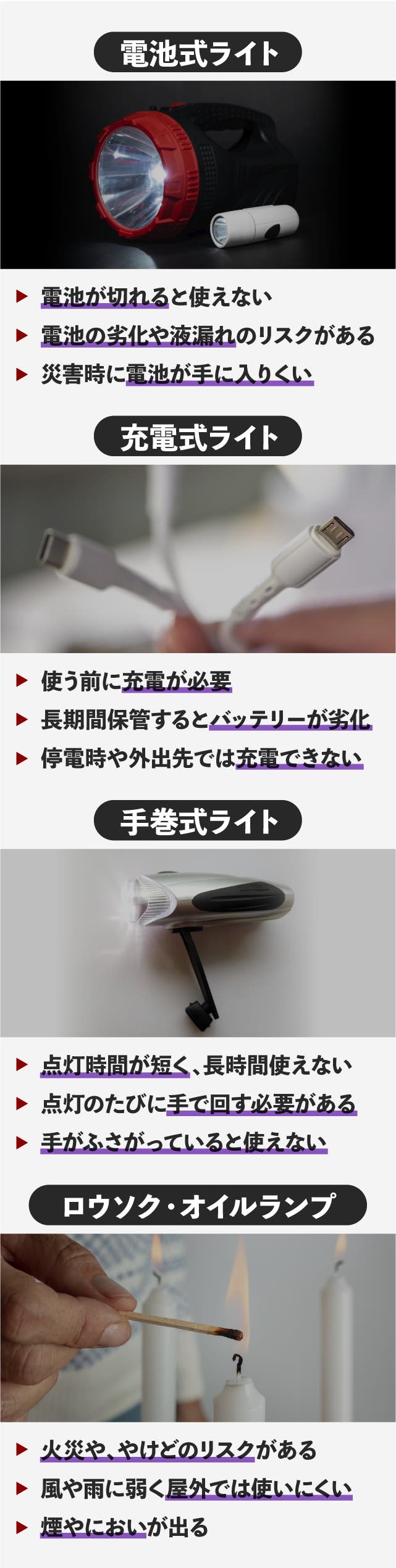 災害や非常時にライトは、自分の居場所を知らせたり、暗い中でスムーズに動くために欠かせません。市販のライトは多くの種類がありますが、それぞれデメリットがあります。
