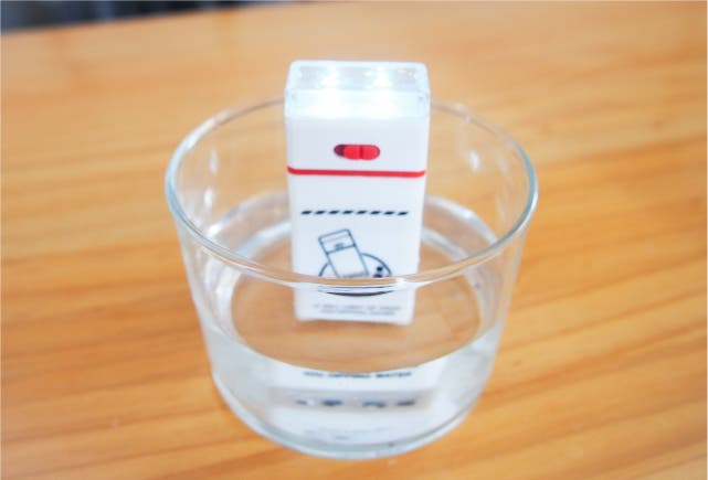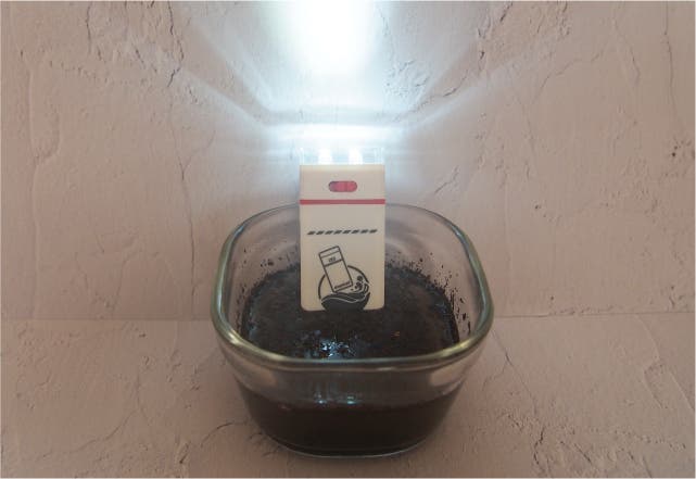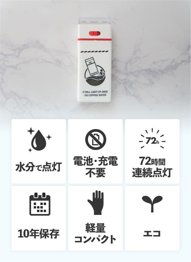 少量の水につけるだけで、電池や充電なしに光ります。災害時や停電時でも、必要なときにすぐ使うことができます。