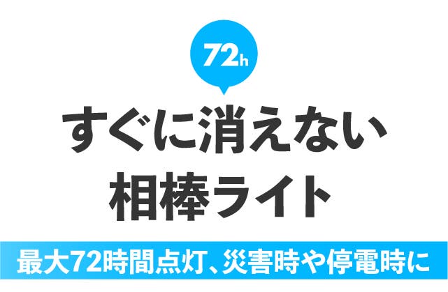 最大72時間途切れず光り続けるので、停電や災害時にも心配なし。登山や釣りなどのアウトドアでも長時間明かりを確保できます。