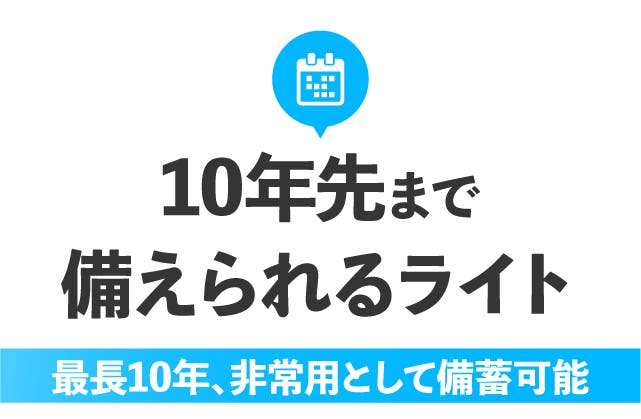 - 備蓄に最適!最大10年の長期保存可能なライト。電池の液漏れや充電切れ、手回しの手間とはおさらば