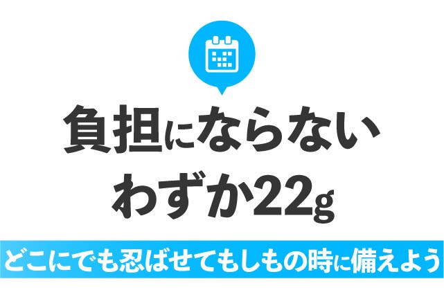 ポケットティッシュとほぼ同じ重さの22gと超軽量。保管時や使用時に邪魔になってはいけないので、コンパクトさは重要なポイントです。