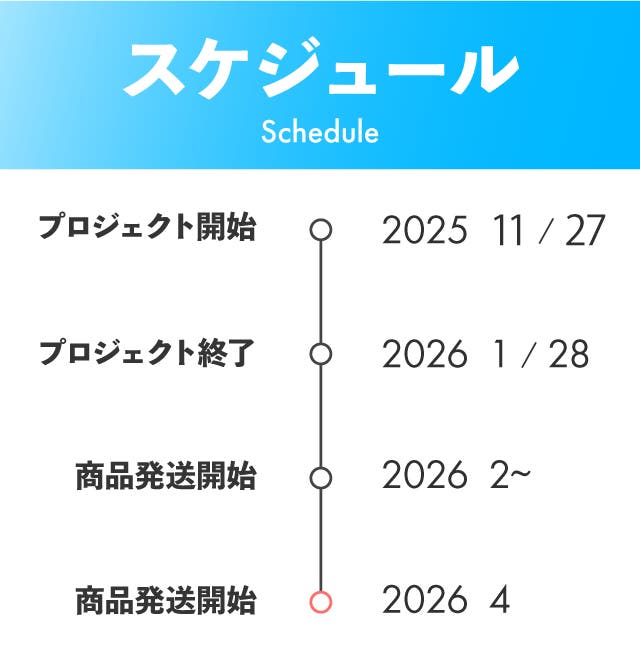 ※以上のスケジュールは、あくまでプロジェクト公開時点の予定です。応援購入の数が想定を上回った場合、製造工程上の都合、配送作業などにより出荷時期が遅れる場合がございます、あらかじめご了承ください。