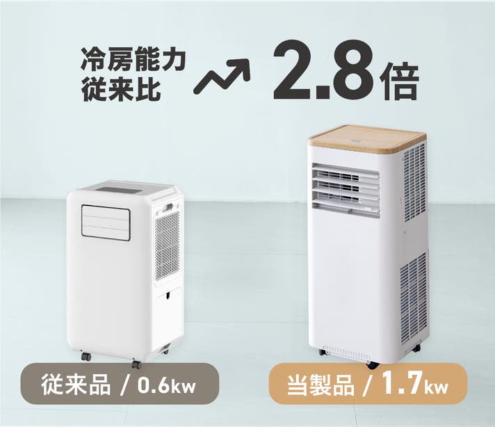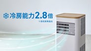- 超冷却!1.7kWの冷房能力×排気温度を抑える独自技術で、ダクトレス方式ながらもパワフル冷風を