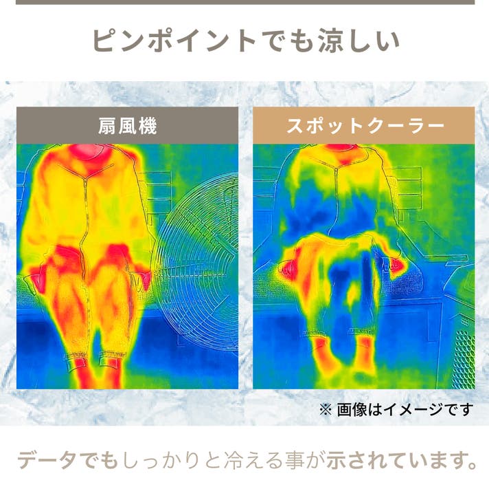 サーモグラフィの比較でも一目瞭然。扇風機に比べ、当製品は圧倒的に冷たい風を届けられるのが強みです。