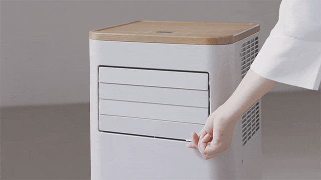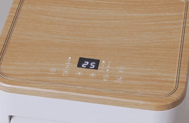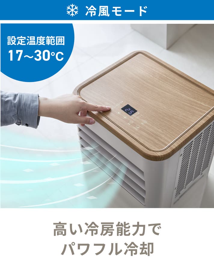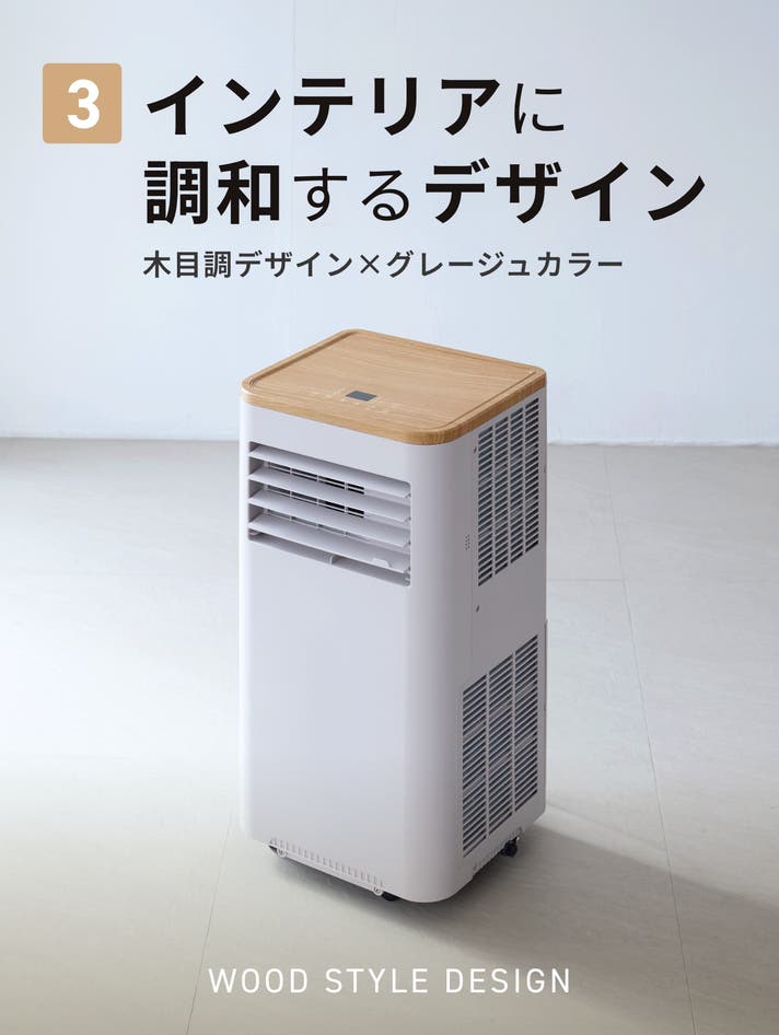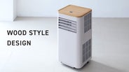 全面ホワイトの四角いフォルムで、いかにも家電のような見た目になりがちなスポットクーラー。本製品は天面操作部に木目調をあしらい、ボディをグレージュカラーに仕上げることで、お部屋にもしっくりと馴染むデザインです。