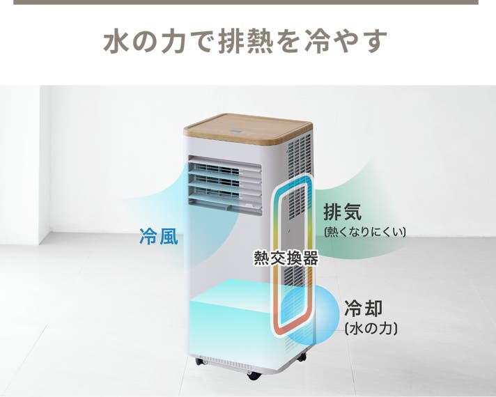 本製品はコンプレッサー方式で冷風を生み出しているため、冷風運転に伴い熱が発生します。その熱を、吸気口から吸い込む風と水の力で冷やすことで、排気の温度上昇を抑える、これが排熱を抑える仕組みです。