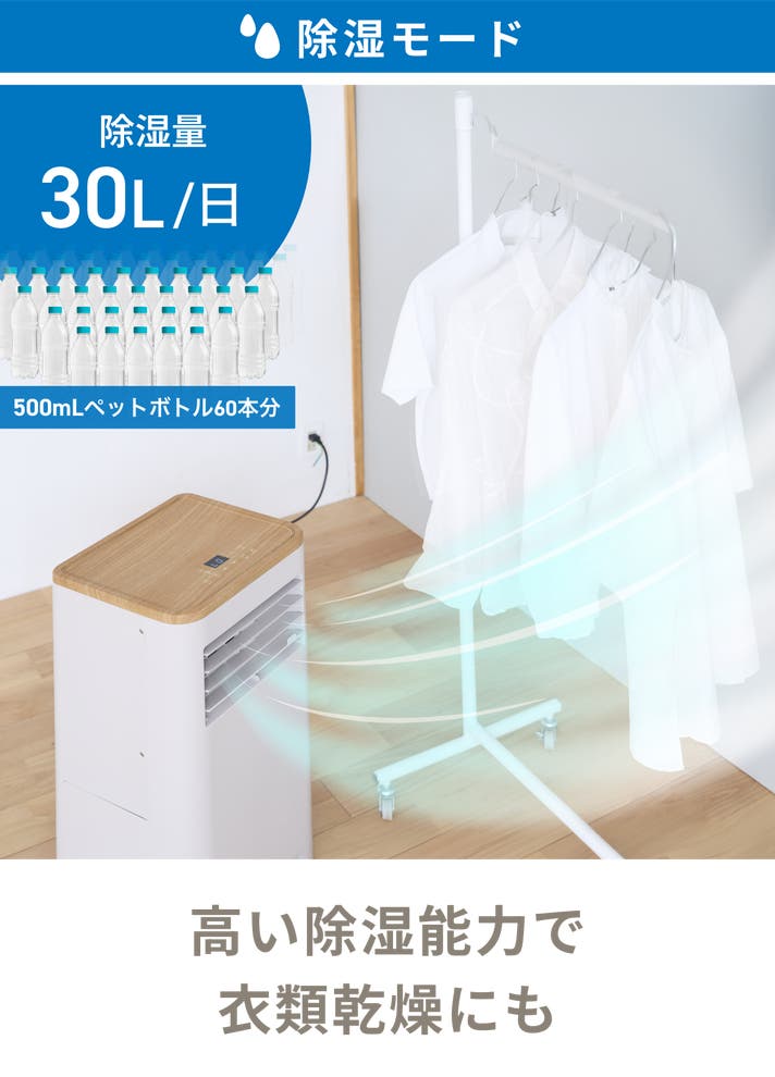 除湿モードでは、部屋の空気を取り込んで水分を水タンクに排出し、乾燥した冷風を送り出します。部屋干し衣類に乾燥した風を当てることで、衣類の乾燥時間短縮をサポートします。