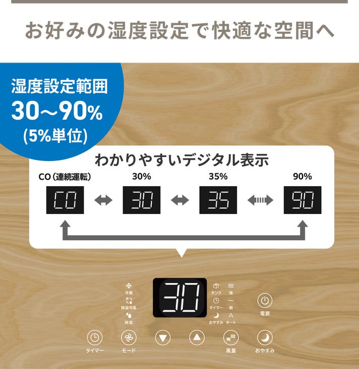 除湿モードとおやすみモード(除湿)時に湿度設定が可能。お好みの湿度にして快適な空間を保ちます。