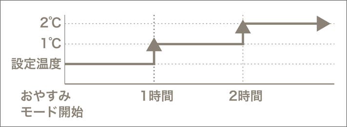 さらに、冷風、除湿冷風モード時に設定することで、時間経過で温度が上昇しながら快適な就寝をサポート。設定温度から1時間後に1℃上昇し、2時間後にさらに1℃上昇します。