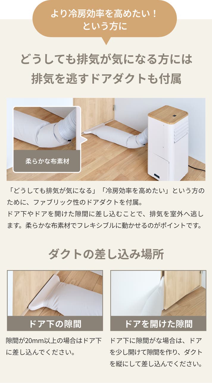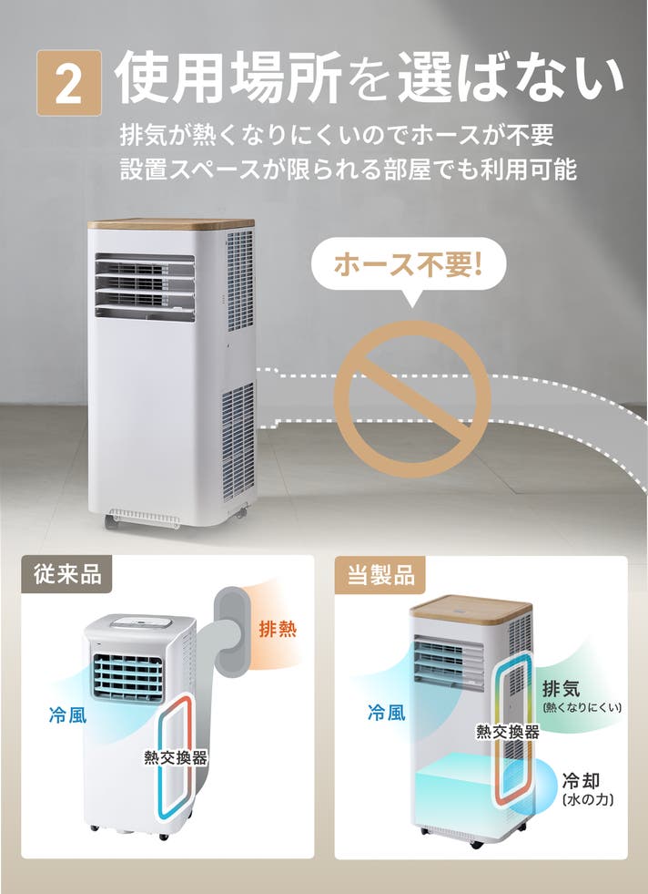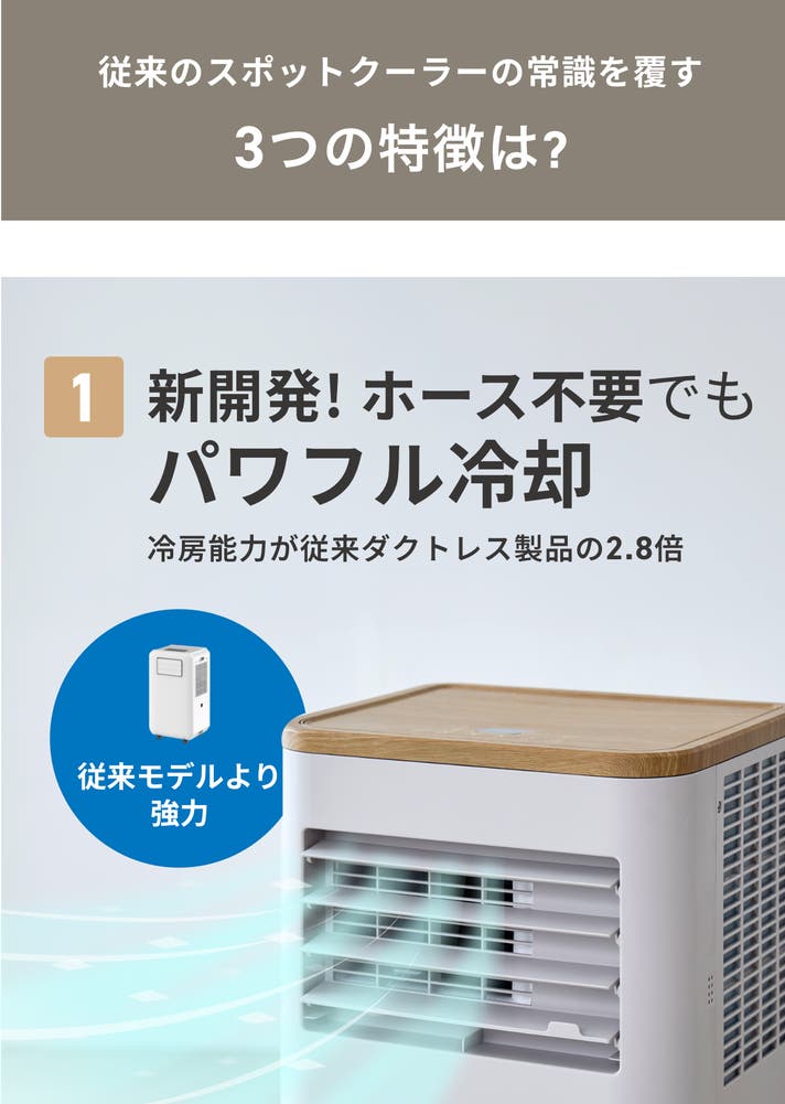 一般的なスポットクーラーには必要な、窓パネルや排気ホース不要の「排熱を抑えた」スポットクーラー。窓の無い部屋など場所を選ばずに使用できるのが最大のポイントです。
