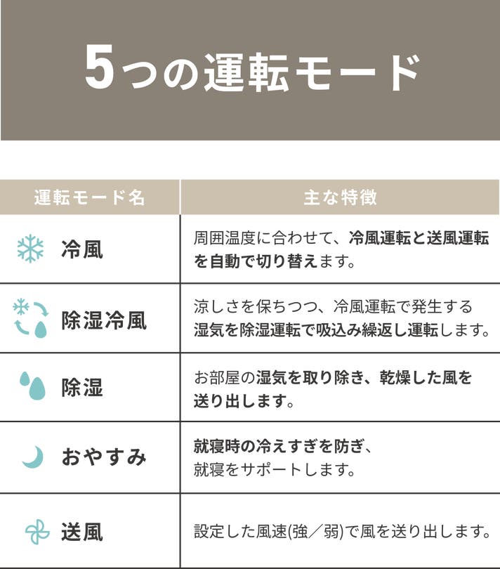 運転モード:冷風、除湿(連続/30~90%)、除湿冷風、送風、おやすみ