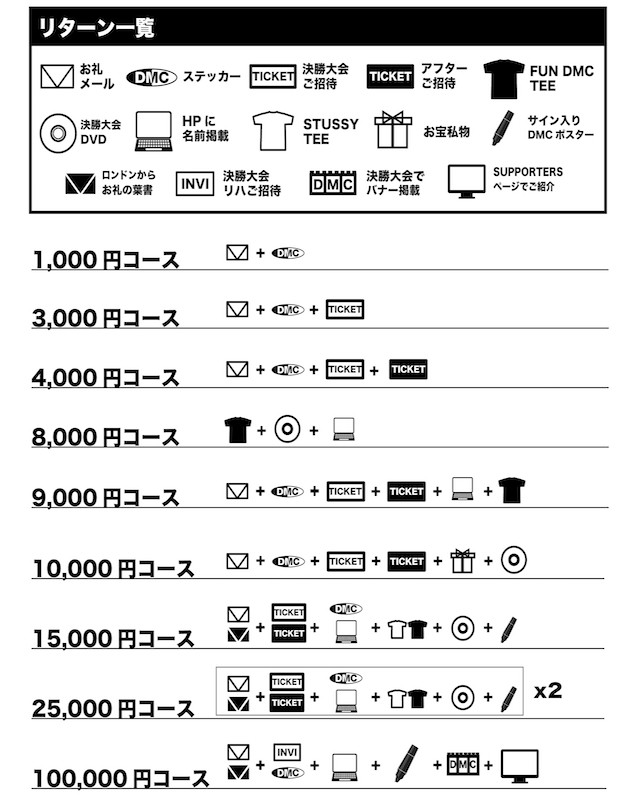 想いに共感頂いて、支援してくれた人に様々なリターンを用意しました。決勝大会への招待や人気のFUN DMC Tシャツのmakuake限定ヴァージョン、各1名様限定のDMC JAPANと縁のあるアーティストや関係者からの私物お宝グッズなどもありますので、それぞれの支援コースをご覧ください。