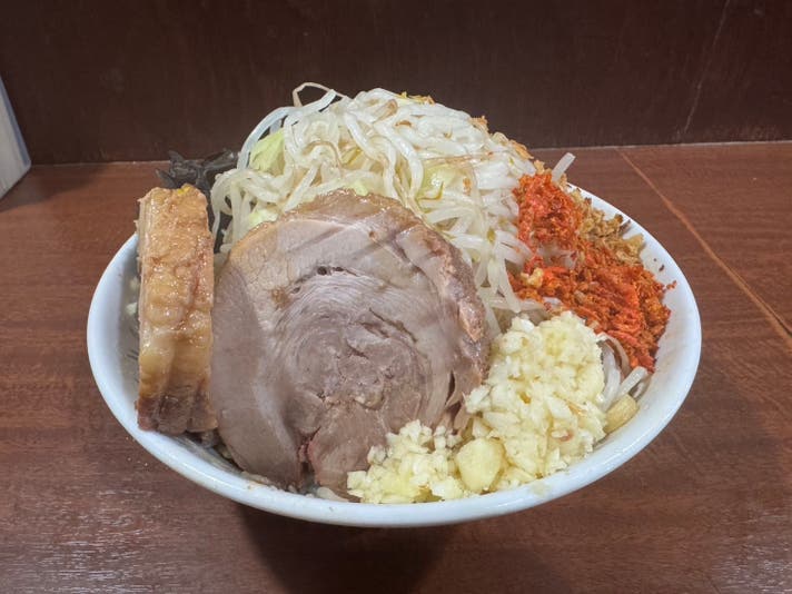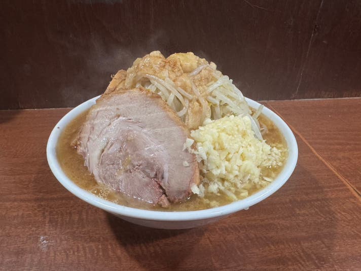 全てのこだわりが詰まった、当店の看板メニュー。そびえ立つ野菜の山、分厚い神豚、そしてワシワシのオーション麺。まずはこれを味わってください。無料トッピング(ニンニク・ヤサイ・アブラ・カラメ)で自分好みの一杯に!