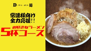 ・D麺を愛してくださるあなたのための特別コース。なんとお好きなラーメンを5杯楽しめます。最大1,900円も安く楽しめる大変お得なリターンです。