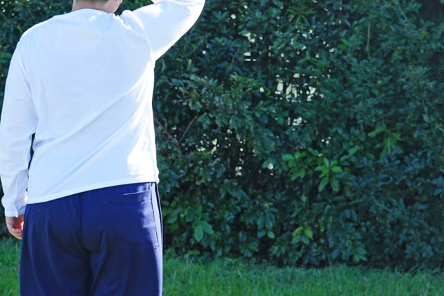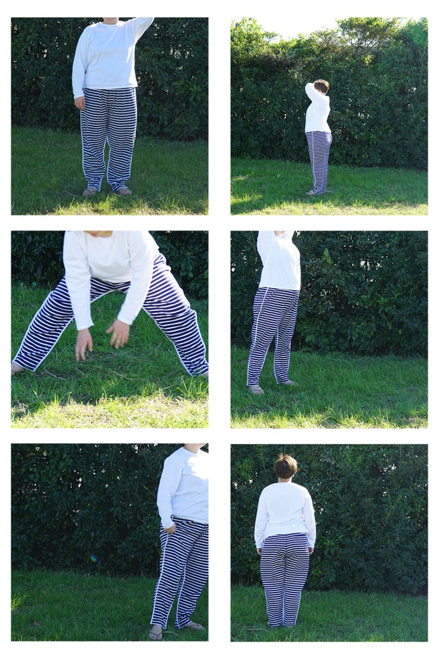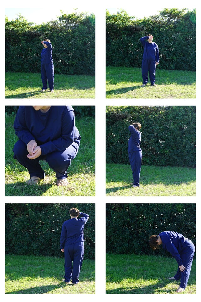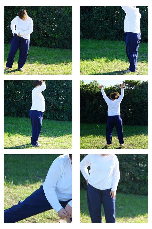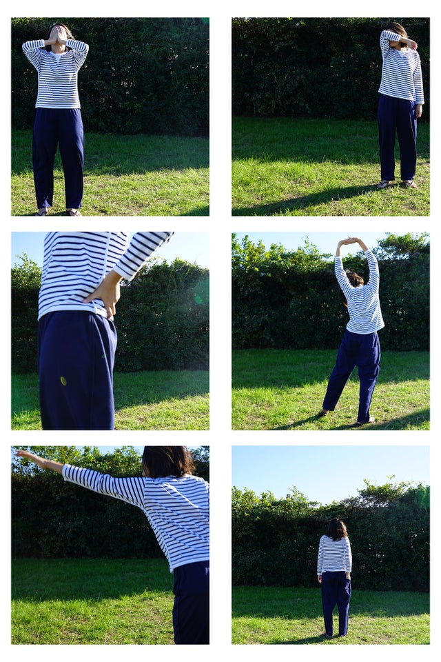 こちらのリラックスウェアでは、洋服によって作られる姿勢がありません。無理なく、どんな姿勢でも受け止めます。座っても、しゃがんでも、ストレッチをしても、窮屈を感じることがありません。
