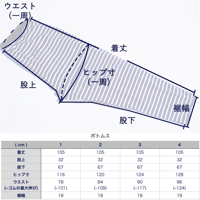※ボトムスは通常のウエスト位置よりもハイウエストになります。(サイズ感は大きめなので、ウエストが100cmのお客様は3をご購入いただいています。)