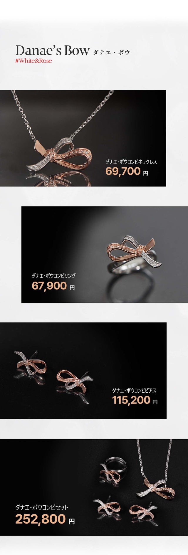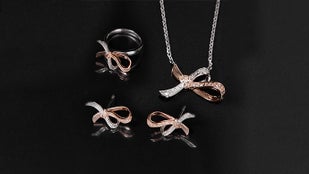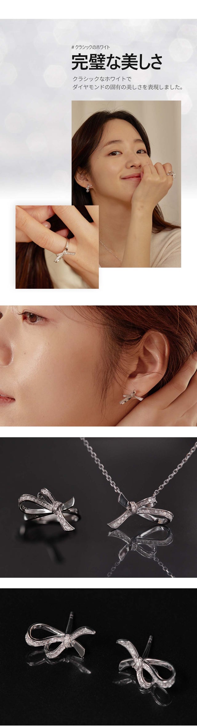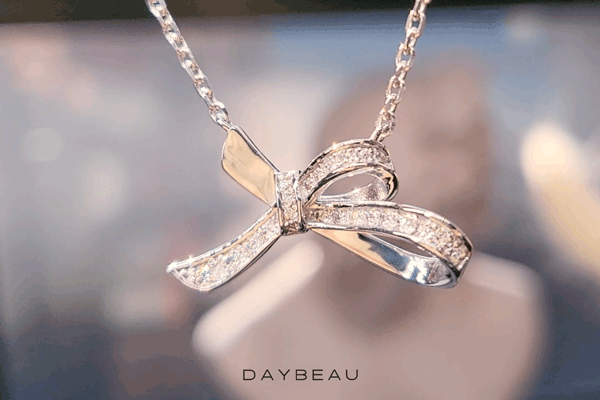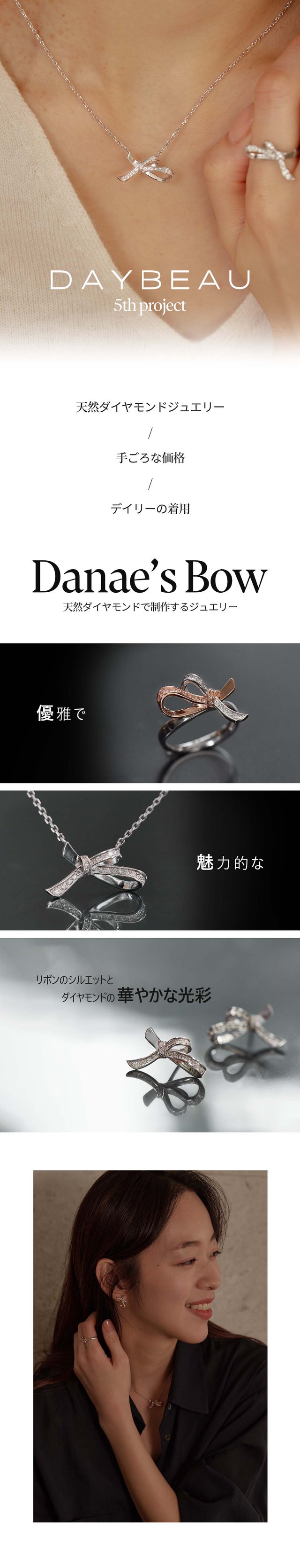 「ダナエボウ・ジュエリー」は今回のプロジェクトのために新しく企画・制作されたシリーズです。優雅なリボンのかたちで洗練された女性の美しさをより印象付けるデザインに構成しました。キラキラ輝く天然ダイヤモンドにリボンかたちのペンダントで、普段着からオフィスルックまでお似合い毎日ご着用できます。