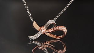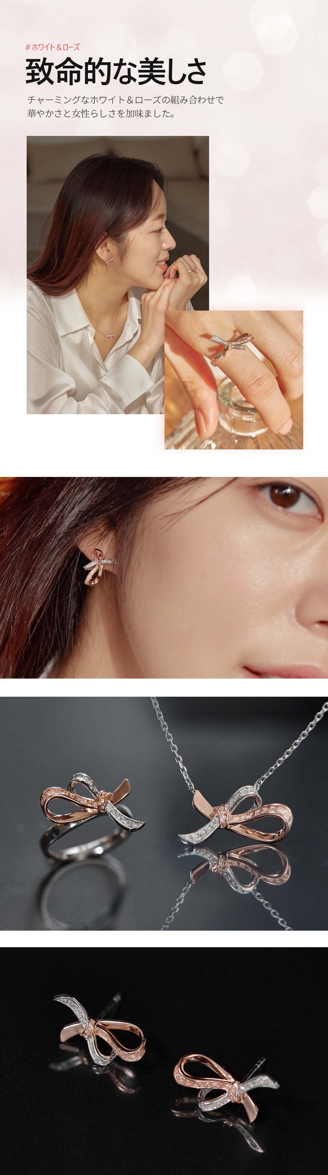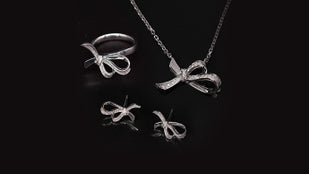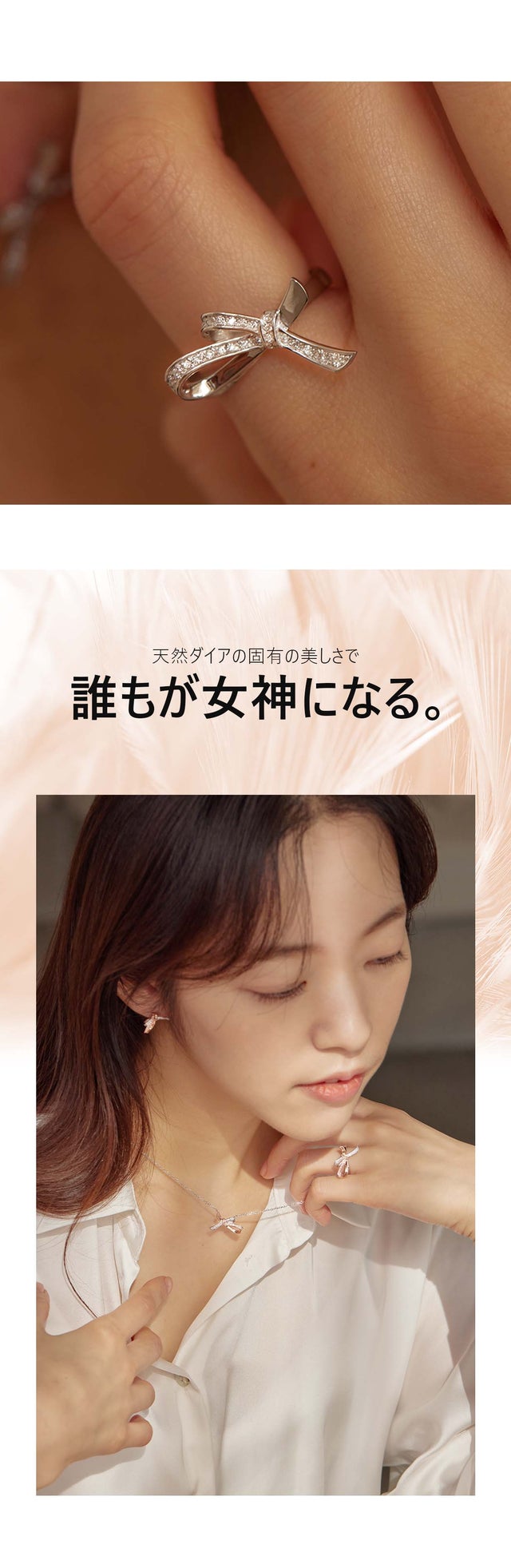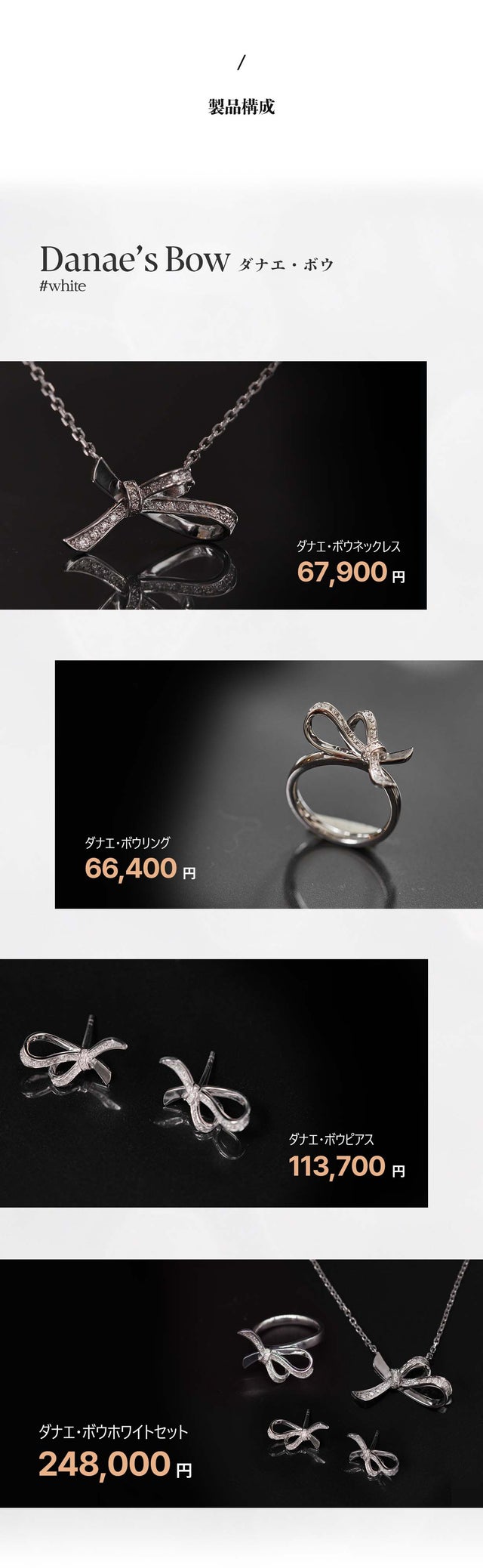 「ダナエボウ・ジュエリー」は今回のプロジェクトのために新しく企画・制作されたシリーズです。優雅なリボンのかたちで洗練された女性の美しさをより印象付けるデザインに構成しました。キラキラ輝く天然ダイヤモンドにリボンかたちのペンダントで、普段着からオフィスルックまでお似合い毎日ご着用できます。