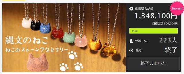 10月にプロジェクトを実施した「縄文のねこ ストーンアクセサリー」予想を遥かに上回る223名、135万円のご支援をいただくことができました。