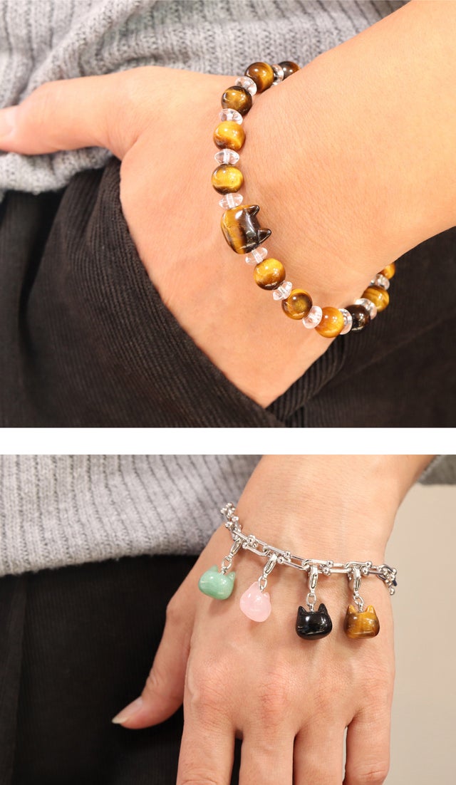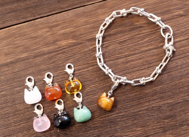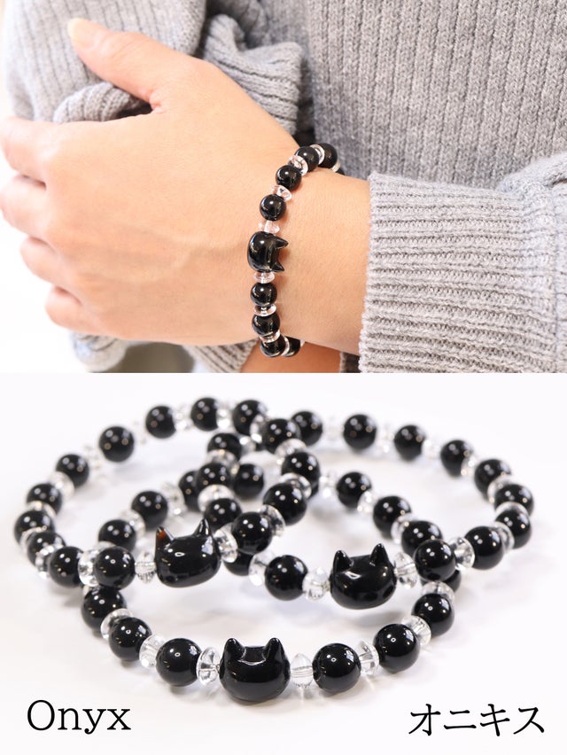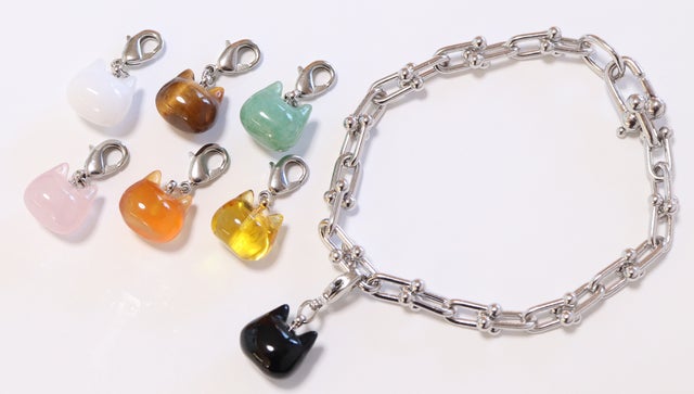 コロンとしたネコのシルエットに彫刻したストーンを、ジュズレットタイプとチャームタイプのブレスレットにしてご案内いたします。