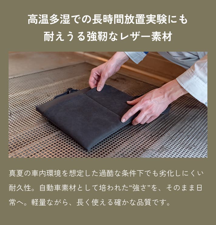 引張・摩耗・耐候・耐汗・耐薬など、自動車の品質試験と同基準で検証された素材です。上質な手触りと確かなタフネスを両立しています。