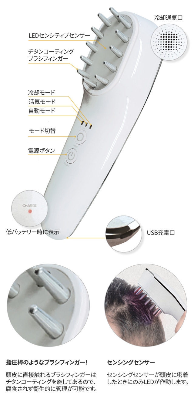 - まるで指圧!チタンのフィンガーヘッドで頭皮をピンポイントに刺激してアプローチ!
