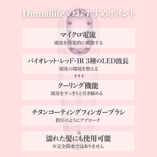 頭皮ケアには答えがありません。多くの人が頭皮の悩みを持っていますが、どのようにケアすべきか分からないのです。わたしたちは、頭皮の悩みを和らげるためのデバイスを作りました。頭皮の乾燥や皮脂の過剰分泌など、水分と油分のバランスを保ち、健やかな頭皮と髪のためのスカルプケアアイテムです。現代人は忙しく、悩むことも多いでしょう。一日たった3分のケアで気持ちよく過ごせるのです。たくさんの方にDr. mallifeを体験していただければ幸いです。