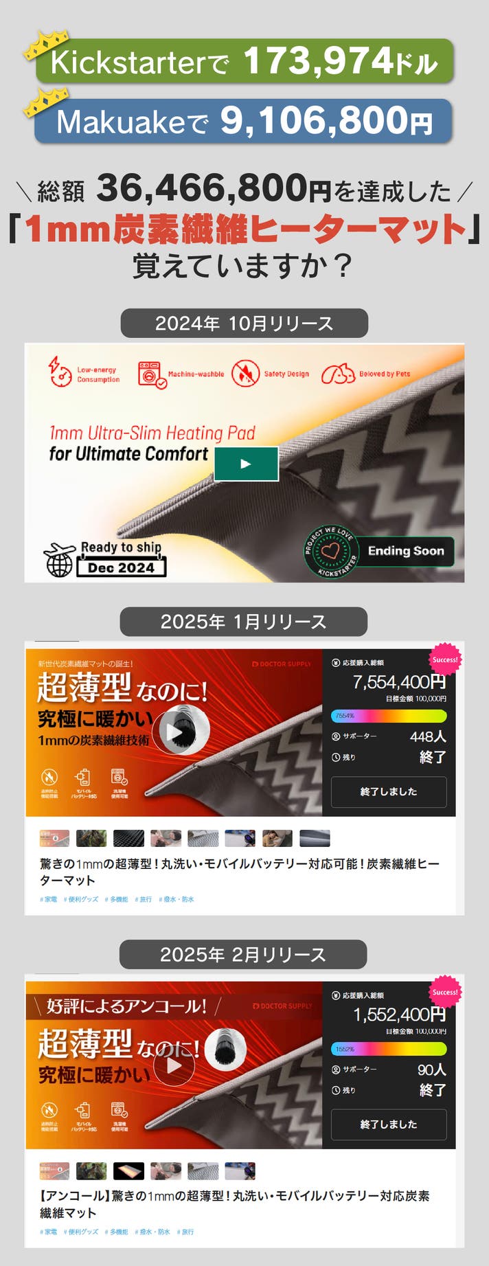 2023年末、ドクターサプライはカーボン繊維技術を活用した携帯用温熱パッド「Dr.sカーボンマット」の最初のバージョンを発売しました。発売後、顧客から携帯性とモビリティの改善を求める声があり、それに応じてUSB-C DCアダプターとUSB-Cモバイルバッテリーの両方に対応した「GenHeat」の第2バージョンを開発しました。