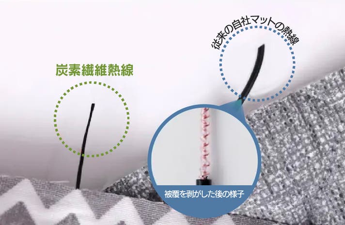 電源が入ると炭素繊維が素早く発熱しますが、この時に炭素繊維をナイロン素材の糸で密に覆うことで、万が一の過熱を防止できるような技術を開発しました。