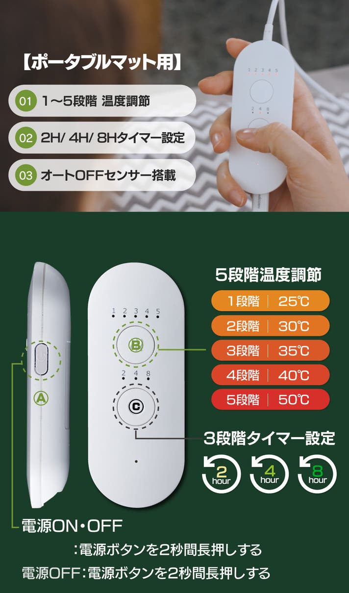 コントローラ上段 ⓑボタンを2秒間長押しするとLEDが点灯し、 ⓑボタンを短く押して1~5段階の温度調節が可能なボタンです。