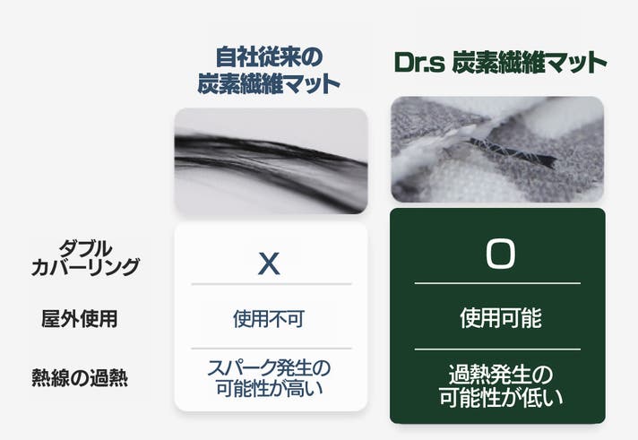 Dr.sの竹繊維マットに使用されているカーボン繊維は、一般的にヒーターマットでよく使用されるPVCやEVAと比較して、軽量で高強度、さらに耐熱性に優れています。また、マット内部には過熱を防ぐセンサーが搭載されており、安全性にも配慮されています。