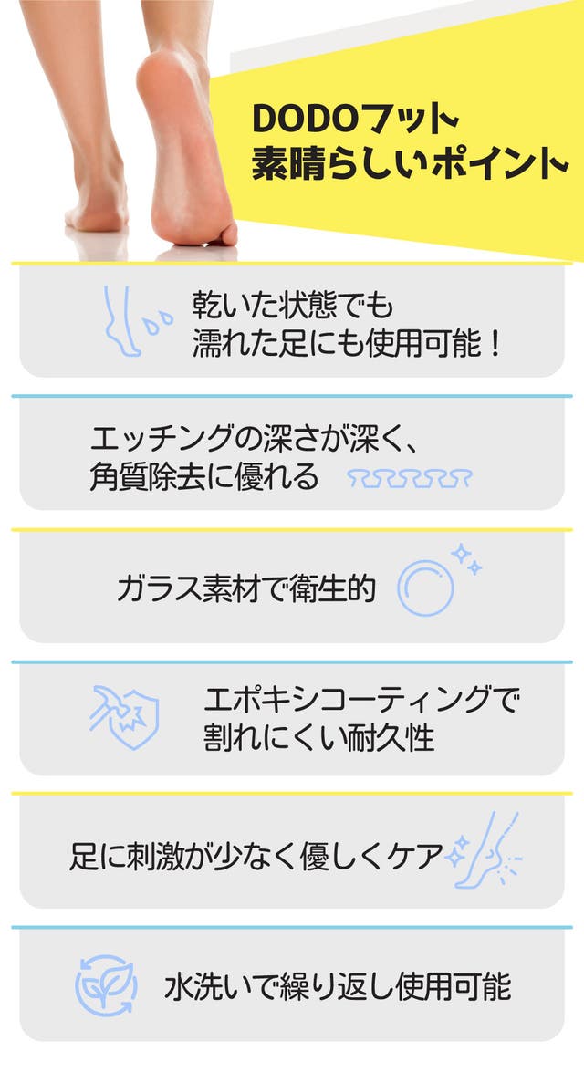 グリップ感が悪く破損しやすい薄いグラス角質取りのデメリットを補うデザインにしました。力を入れすぎずに足裏をより楽にケアしてください。