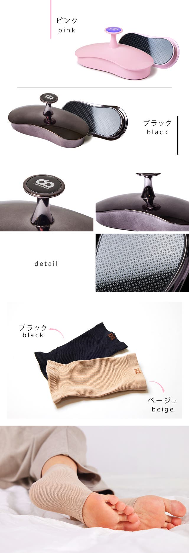 この商品を輸入しようと思った理由:固まったかかとで悩みを抱えている方に簡単セルフケアができ、プロのような仕上がりができるDODOフットを紹介したいと思いました。特に角質取りケア後のキレイな足を保つことが難しい方には専用ソックスで次の日にも滑らかな足でいられるようにセットで構成しています。