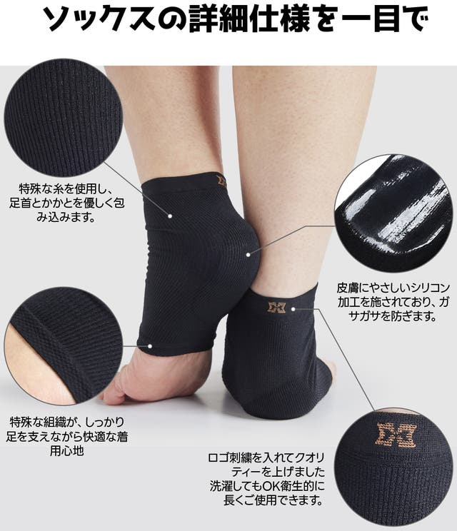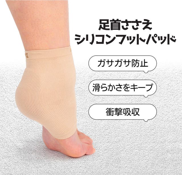 かかとにシリコンパットが寝ている間に、乾燥しないよう保護してくれるため、なめらかさをキープすることができます。また、靴下や靴の中にも履けることができ、外部の衝撃から守ってくれます。