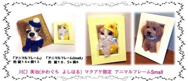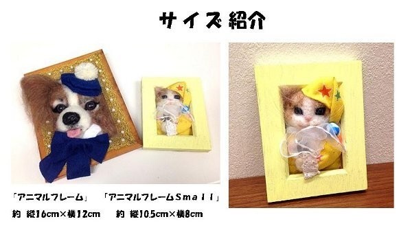 プロジェクト終了後、お写真をMaukukeメッセージ添付でお送り頂きます(正面・横)目の色や性格などもお伺い致します。洋服の有、無などもご希望に沿えますので、にMakuakeメッセージ機能よりご希望をお伺い致します。「アニマルフレームSmall」はサイズが小さい為、細かいご要望にはお答えできない場合がございますのでご了承下さいませ。犬・猫・ウサギ・ハムスター・鳥なども作成致します。記載にない動物作成をご希望の場合、お申込み頂く前に必ず本文の上部にございます「実行者へ問い合わせ」よりご連絡ください。作成可能かどうか確認をさせて頂いた上でご支援頂けたらと思います。