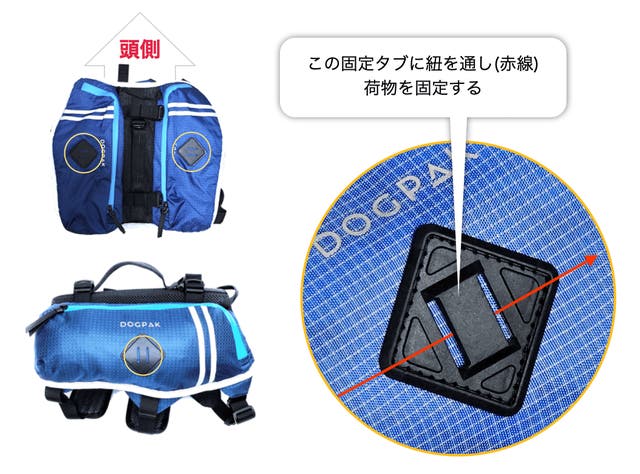 どうしてもリュックに入らない荷物は、固定タブに紐を通して結ぶことでトップに固定できます。大きくてかさばる荷物も「ワンちゃんへのお仕事」として、ぜひ背負わせてあげてください。