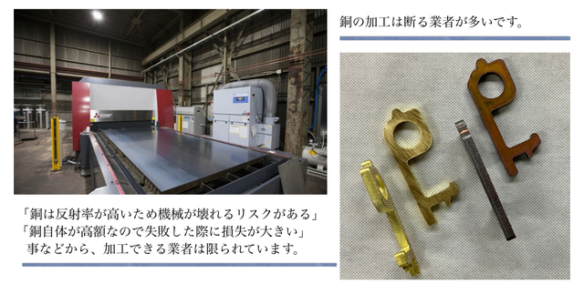 ②切断 三菱電機製のファイバーレーザー加工機で銅と真鍮の6mm厚の切断加工が可能に。当初、コストを抑えるのであればと炭酸ガスレーザー加工による3mm厚のサンプルもつくりましたが、厚みが薄いと力をいれる際に指が痛く日常使いには不向きとわかり、6mm厚加工に至りました。