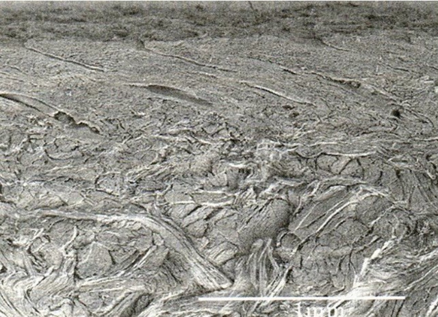 この極細繊維が撚り集まって1本の繊維束となり、その繊維束が密に織り重なった構造を形成しています。